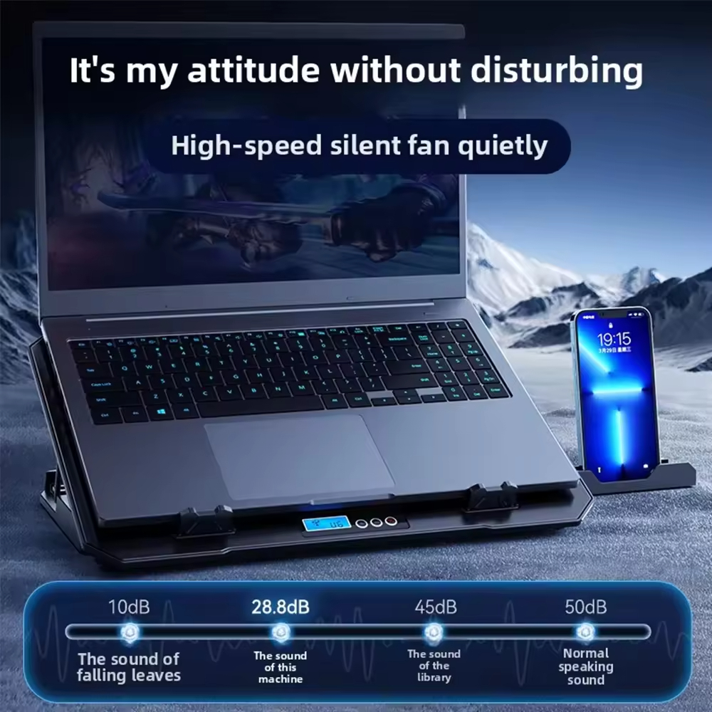 This cooling pad combines advanced technology with user-centric design. The LCD display allows real-time speed management, while the six fans ensure rapid cooling across your laptop’s surface. Its adjustable height promotes better posture, and the robust materials provide long-lasting reliability. Whether for work, gaming, or entertainment, it’s an essential accessory to prevent overheating, reduce noise, and boost device efficiency.